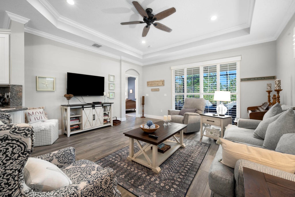 Welcome to this beautifully upgraded villa in a serene and secure 55+ gated community. Designed for comfort and luxury living, this home boasts an array of high-end features and upgrades throughout. Step inside to find elegant tile plank flooring that extends seamlessly throughout the entire home. Impact-resistant windows and doors offer peace of mind. The open-concept living space is enhanced by tray ceilings, crown molding, and plantation shutters, creating a warm, inviting atmosphere. The chef-inspired kitchen is a true highlight, featuring upgraded cabinetry with convenient pull-outs, sleek granite countertops & backsplash, and premium stainless steel appliances. Pendant lighting above the expansive counter adds a touch of sophistication, perfect for both cooking and entertaining. ThThe spacious master suite is a private retreat, with a tray ceiling that adds to its grandeur. The en-suite bathroom offers a spa-like experience, and the second bedroom and bath provides ample space for guests. Work or create in your conveniently located den / office space. Enjoy the outdoors from the extended paver patio and screened lanai, where you can unwind while taking in the peaceful preserve view! Whether hosting a BBQ or enjoying morning coffee, this outdoor space offers tranquility and privacy. As a resident of this community, you'll have access to fantastic amenities, including a sparkling pool and clubhouse with a variety of social activities designed for a vibrant and active lifestyle. This villa combines style, functionality, and peace of mind in a location designed for those who appreciate the finer things in life. Don't miss the opportunity to call this gem your new home!
