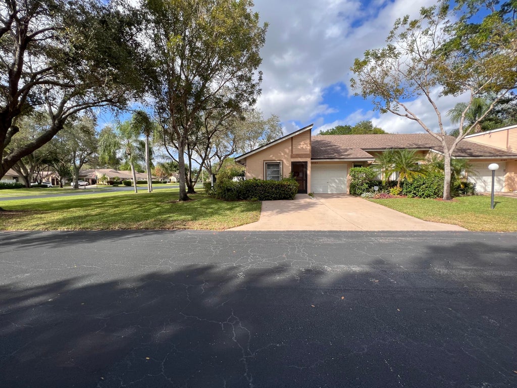 Welcome to the epitome of serene living in the Parklane subdivision, nestled within a beautifully entranced gated community. This unique corner location offers an enviable lifestyle, with a park on the left and another directly in front, where picturesque nature scenes unfold daily. The condo boasts accordion hurricane shutters for protection and a private yard adorned with butterflies, leading to an open pavered patio complete with a fenced area for privacy, ideal for outside lounging or dining. The interior is just as impressive, featuring a vaulted ceiling and a renovated two-bedroom, two-bath layout, with an additional enclosed patio with central AC that can serve as a third room. A one-car garage with extra storage and a driveway capable of accommodating three cars provide ample space. The upgraded chef's kitchen is outfitted with granite countertops and pull-out cabinet drawers, while the spacious dining and family room lead to a huge master bedroom with generous closet space and a beautifully renovated bathroom. Residents can enjoy a private washer and dryer inside the condo and take advantage of the community's heated pool, hot tub, clubhouse activities like billiards, card games, and events, or relax in the sauna. Tennis and pickleball courts, a nearby lake for fishing, and proximity to town center malls, beaches, and a variety of shops and restaurants make this an unbeatable location for vibrant living.