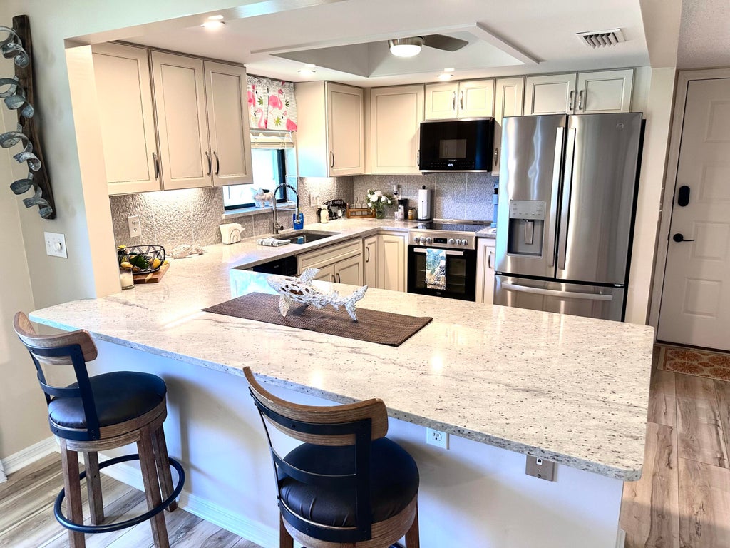 PRICE REDUCED TO SELLL NOW! - Tastefully remodeled 2/2 corner unit on 2nd floor in one of Martin County's most desirable & active 55+ communities. Recent updates: Custom kitchen cabinetry has soft close, pots & pans drawers, built-in matching pantry, granite countertops, stainless appliances, bathroom vanities/tops & mirrors, A/C system, LED light fixtures, LVP (Luxury Vinyl Plank) flooring in main living areas. Kitchen/dining wall removed to open area. You'll be amazed at all of the amenities offered to you as an owner in South River Condominium. Heated/cooled pool, clubhouse, bocce, pickleball, boat ramp, boat/trailer storage & more! Community is very well maintained. HOA fee: $484/mo. Bike to new Costco! Priced right. Sellers want this unit sold now! Sorry NO PETS. No lease 1st year