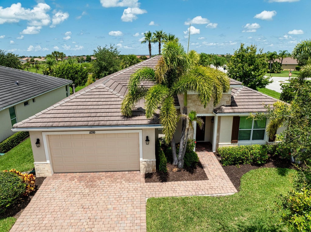 Located on a beautifully landscaped corner lot, this spacious 2-bedroom, 2.5-bath home with a versatile den offers over 2,100 square feet of elegant living in a thoughtfully designed layout. The home welcomes you with a large, open family room featuring soaring ceilings--perfect for entertaining or relaxing in style. The gourmet kitchen is equipped with upgraded 42-inch cabinets, granite countertops, a gas range, and ample storage, seamlessly connecting to the dining and living areas. The expansive master suite is a private retreat with a custom walk-in closet and a well-appointed en-suite bathroom featuring his and hers sinks and a large walk in shower. The split floor plan ensures privacy, with a generous second bedroom offering its own en-suite bath, ideal for guests.The den, located just off the main living area, provides flexible space for an office, reading room, or hobby area. A convenient half bath off the living room adds additional comfort for visitors. The large laundry room offers extra storage and functionality. Step outside to the screened and covered lanai, surrounded by lush privacy landscaping, perfect for enjoying quiet mornings or peaceful evenings. This home perfectly combines comfort, style, and functionality in a prime corner-lot setting.