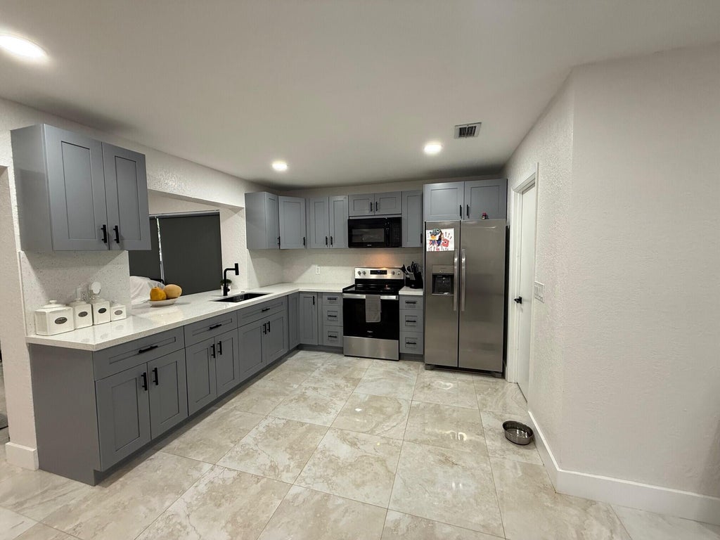 Motivated Seller! Beautifully remodeled 3-bedroom, 2-bath home located on a quiet cul-de-sac with no HOA. This home features porcelain tile flooring, modern LED lighting, ceiling fans with remotes, and a fully updated kitchen with blue cabinetry, quartz countertops, backsplash, and stainless-steel appliances. Enjoy a spacious backyard, enclosed patio, 1-car garage, laundry room with washer and dryer, accordion hurricane shutters, and a new impact-rated front door.