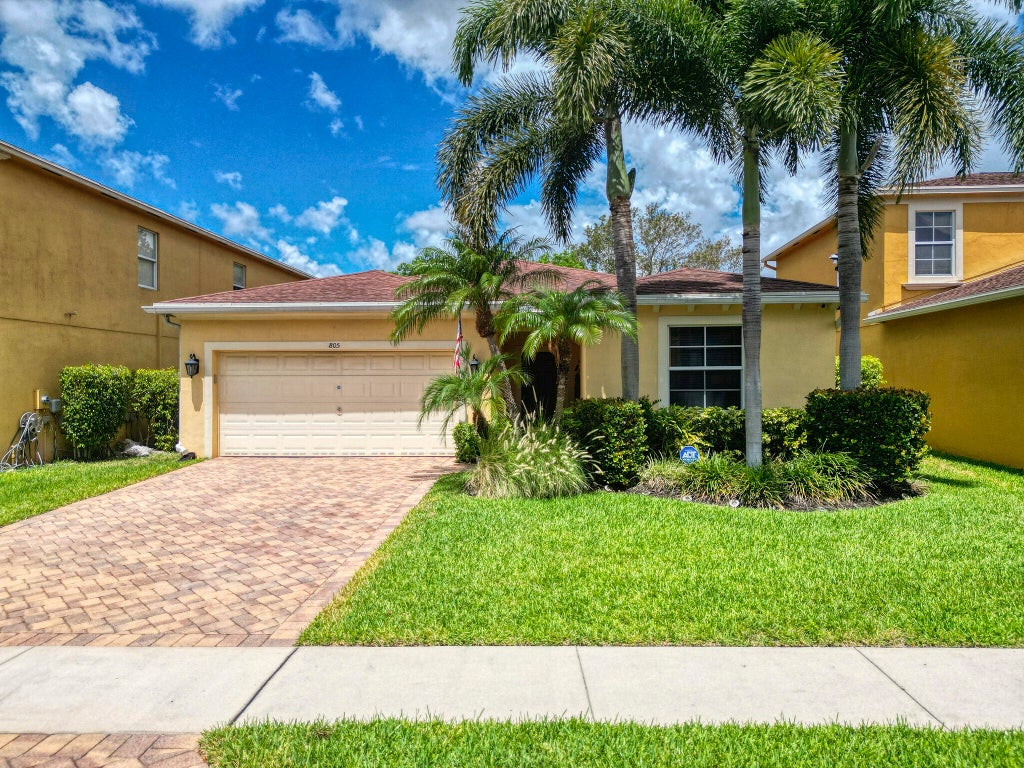 Welcome to 805 Quartz Terrace--a spacious and well-maintained 3-bedroom, 2-bathroom home with a 2-car garage, ideally situated on a peaceful lakefront lot in the desirable community of Sunterra in West Palm Beach. This single-story residence offers an open, functional layout with bright living spaces, a split-bedroom floor plan, and beautiful views of the water from your private backyard. The kitchen features ample counter space and cabinetry, perfect for cooking or entertaining. The primary suite includes serene lake views, 2 walk-in closets, and an en-suite bath with dual vanities and a walk-in shower. Two additional bedrooms provide comfort and flexibility for guests, family, or a home office. Enjoy the tranquility of your lakefront backyard--ideal for relaxing mornings, sunset dining,or weekend gatherings. DVR + 7 wired security cams, 4 cams are 4k video. ADT wired sensors to every window & door - control panel installed at front and garage doors. Motion flood lights installed on N and W perimeters of house. TAEXX pest control system in walls and throughout interior perimeter of house