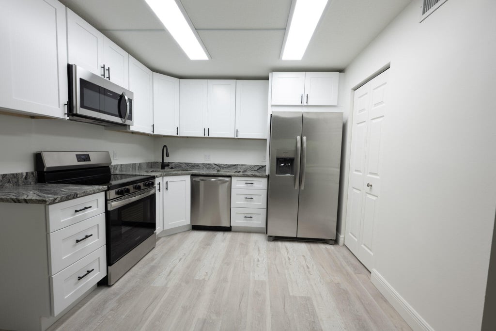Step into comfort and convenience with this fully updated 1 bedroom, 1 bath first-floor condo, ideally located with easy access to I-95 and the Turnpike. The open-concept kitchen is a chef's dream, featuring stainless steel appliances, crisp white shaker cabinetry, and elegant granite countertop. Enjoy the ease of in-unit laundry with a brand-new full-size washer and dryer, plus stylish new vinyl plank flooring throughout. Relax in the spacious screened porch--perfect for sipping your morning coffee or unwinding in the evening. Bathroom has been tastefully updated, and brand-new hurricane impact windows will be installed within weeks, adding peace of mind and energy efficiency. Amenities include a large pool, tennis and racquetball courts, BBQ areas, & scenic walking paths with lake view