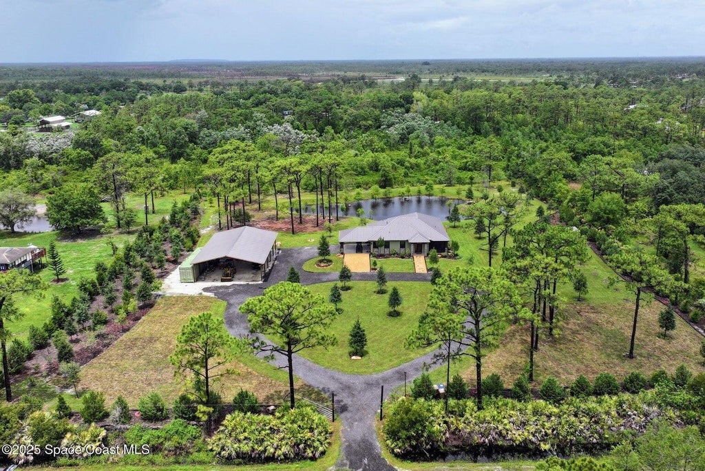 CBS 2BR/2BA custom home on 5 acres with a peaceful pond, private island, waterfall, and land bridges. Built with beetle-kill pine harvested on-site--also used for unique furniture--it blends rustic charm and smart design. Accessibility features include a primary bath and deep soaking tub. Triple sliders offer serene views. Kitchen and baths have granite and knotty pine accents. Large utility room with dog wash. Includes 40x60 pole barn, 2 RV hookups, and expansion space. Surrounded by 300+ trees with frequent wildlife. At the end of a quiet road, ag-zoned, no HOA, and borders Wildlife Management Area--just minutes from Space Coast, Orlando Airport, theme parks, and beaches.