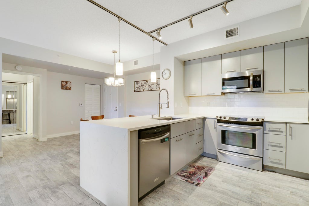 Beautiful Corner Unit in The Courtyards at City Place Discover this stunning two-bedroom, two-bathroom corner condo in The Courtyards at City Place, offering an abundance of natural light thanks to extra windows that brighten every room. The modern kitchen features sleek quartz countertops with a stylish waterfall finish, complemented by wood-look tile floors throughout for a contemporary yet warm feel. This move-in-ready home is perfect for those seeking convenience and comfort.