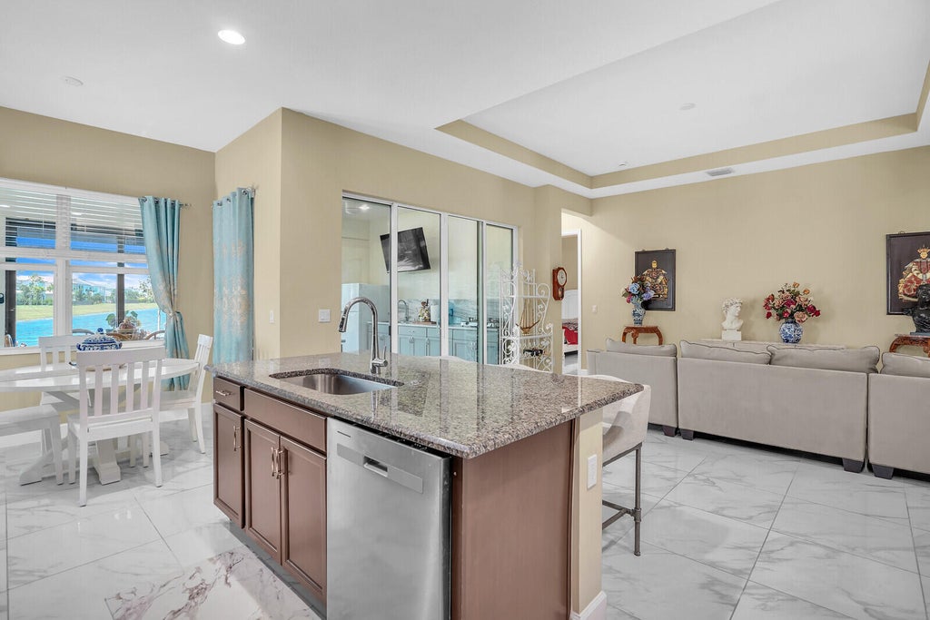 Newly built 3 bed, 3 bath waterfront home in the Orchards of Westlake, completed in 2024. After construction, the owners enhanced the property with a rare built-out kitchen extension and a large screened-in patio, creating exceptional indoor and outdoor living spaces. The extended kitchen provides abundant room for cooking, entertaining, and storage, while the expansive patio overlooks the tranquil lake and is ideal for gatherings year-round. Inside, the open floor plan flows through the living and dining areas, and the primary suite features beautiful lake views and a relaxing retreat. Secondary bedrooms and bathrooms provide comfort for family or guests. Westlake residents enjoy resort-style amenities including a lagoon pool, splash park, playgrounds, sports courts, and trails.