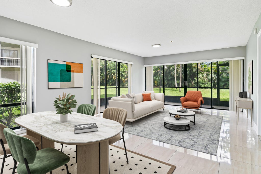 Big beautiful all ages first floor 2 bed 2 bath corner in Lands of the President! Some photos virtually enhanced. Unique wrap-around screened porch to enjoy the sprawling serene green space in the backyard. It's like living in a single family home! Inside, find shiny modern tile flooring throughout, elegant kitchen with rich dark cabinets, granite counter tops, stainless steel appliances and in-unit laundry. Bedrooms are thoughtfully separated by large open living space. Pool just a few steps away. Location is priceless; minutes to PBI, I95, beautiful Palm Beach, bustling downtown West Palm Beach with shopping, restaurants and all the great amenities you love, yet serene and secluded. It's time: leave the stress, come decompress, and LOVE WHERE YOU LIVE!