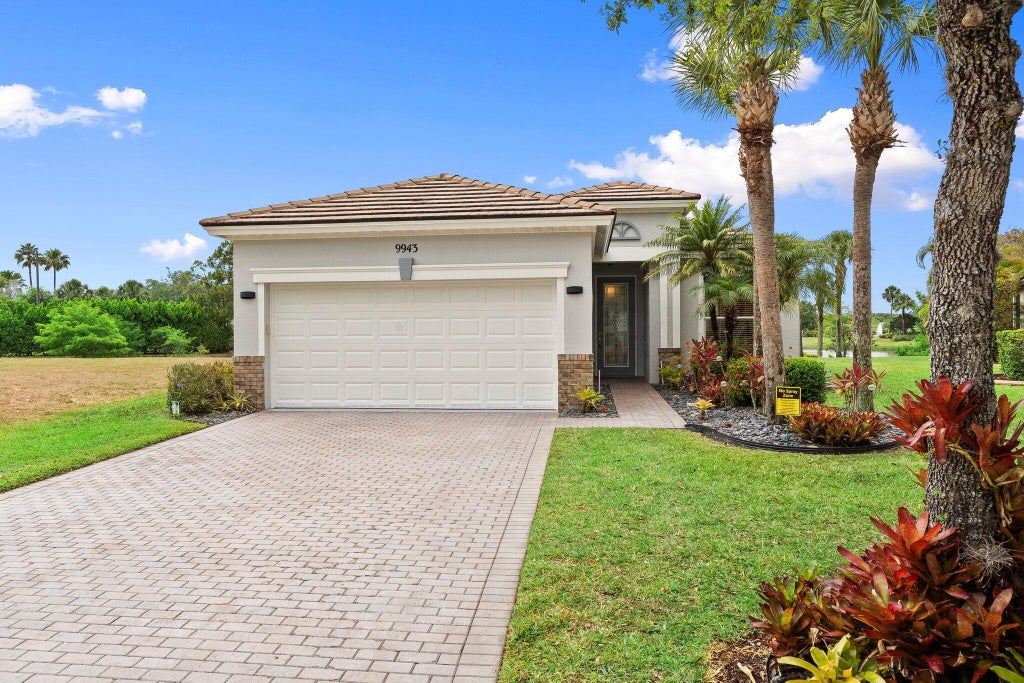 Move-in ready Victorian model in the gated Heritage Oaks community of Tradition, offering serene lake views and ultimate privacy. Situated on a pie-shaped, premium lot with no rear neighbors and an empty lot next door, this well-maintained 3-bedroom, 2-bathroom home features a bright, open floor plan with fresh interior and exterior paint, new carpet in the bedrooms, and tile throughout the main living areas. The spacious living and dining areas include a kitchen pass-through and an archway that leads to a breakfast nook with garden views. The updated kitchen showcases granite countertops, stainless steel appliances, a pantry, and recessed lighting. The generous master suite offers two walk-in closets, a tray ceiling, and an ensuite bath with dual vanities, a separate soaking tub, and alarge walk-in shower. Two guest bedrooms and a full bath are located at the front of the home, providing ideal separation for privacy. Enjoy outdoor living on the covered, screened-in patio overlooking the tranquil lake. Additional features include a laundry room, epoxy-coated 2-car garage floor, new hot water heater, and vibrant landscaping. Heritage Oaks amenities include a clubhouse, resort-style pool, hot tub, fitness center, and social room. HOA fees cover lawn maintenance, basic cable, and internet. Conveniently located minutes from I-95, Cleveland Clinic, and all the shopping, dining, and entertainment that Tradition has to offer.
