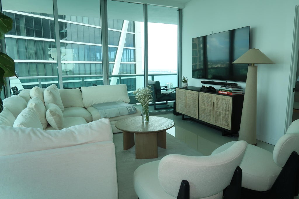 Stunning 48th-floor corner unit at 900 Biscayne Bay -- a light-filled, modern 2-bed / 2-bath/1/2 guest bath- residence featuring marble countertops, a master bath with tub and separate shower, generous closet storage and upgraded window treatments (both electric and manual) for turnkey living. Enjoy breathtaking bay and city views, three balconies and an open, entertainer-friendly layout. The building delivers five-star living with resort-style pools, full spa and wellness center, private theater, 24-hour concierge/valet and extensive resident amenities -- all just steps from Museum Park, top restaurants and Downtown Miami's dining & nightlife.all information to be verified- amenities include pool, spa, sauna steam room, gym.
